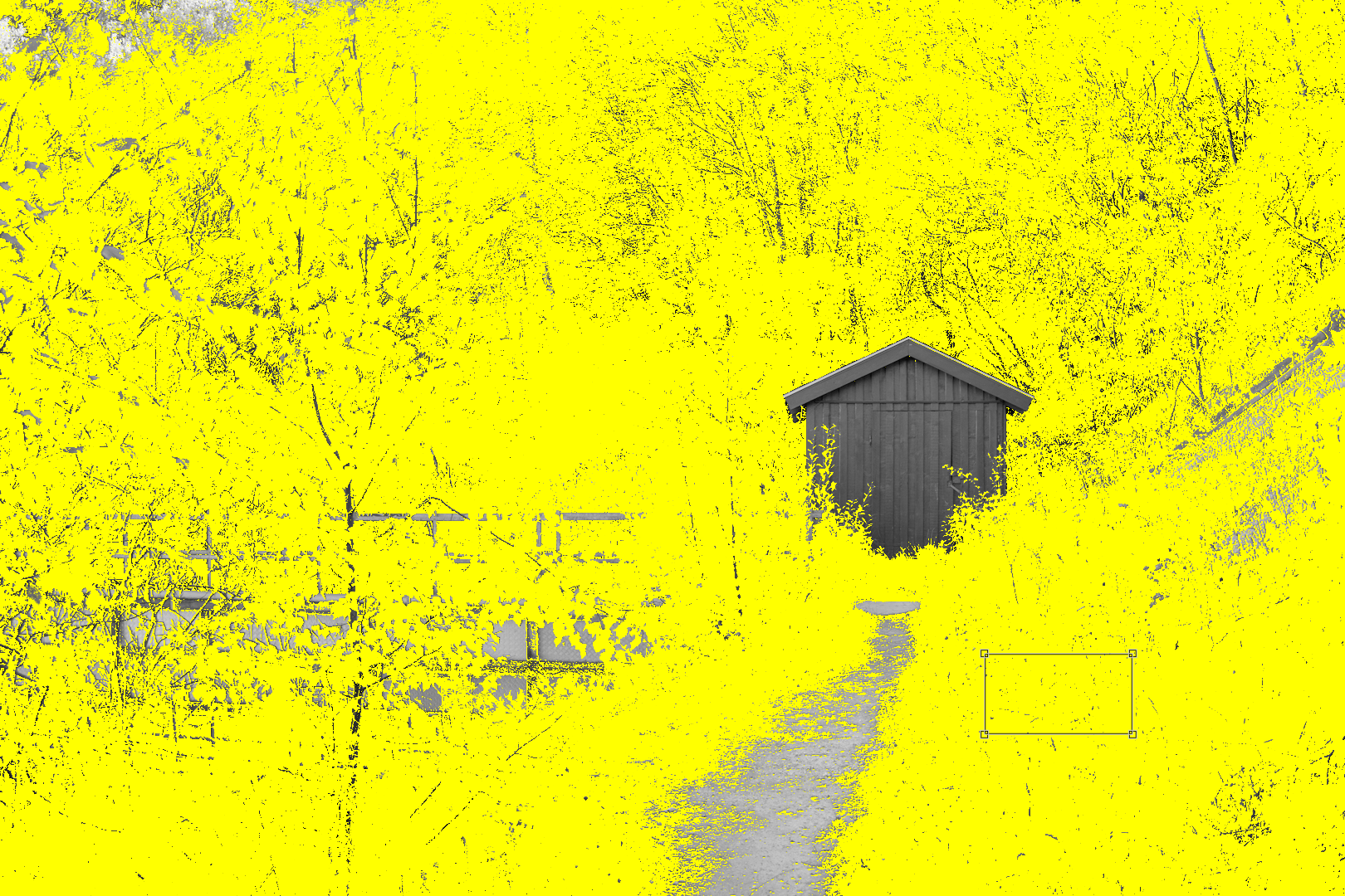 I selected a region of green leaves, and all the green parts in the image now show up in yellow (i.e., are included in the mask). It's mostly the hut and the footpath that are left out of the selection.