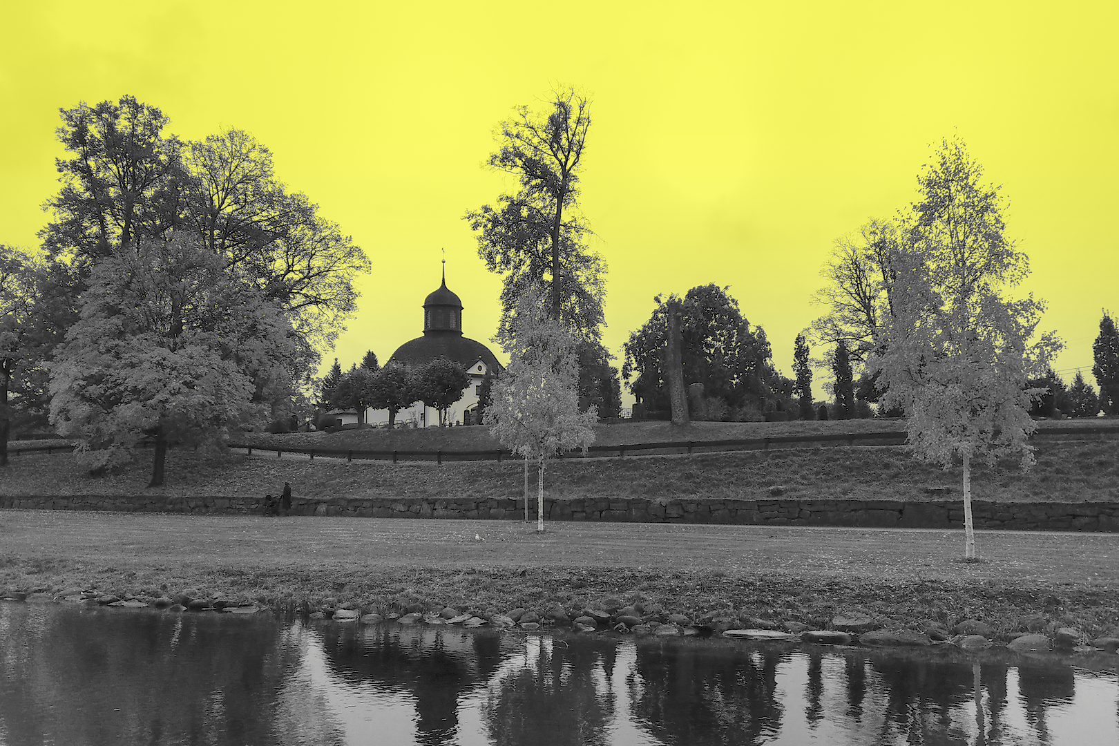 I took the following picture against the sun (behind a cover of clouds), which made the sky look extremely bright and colorless. I thought the image might look more balanced when the sky is darkened a little bit and given a tint of blue: