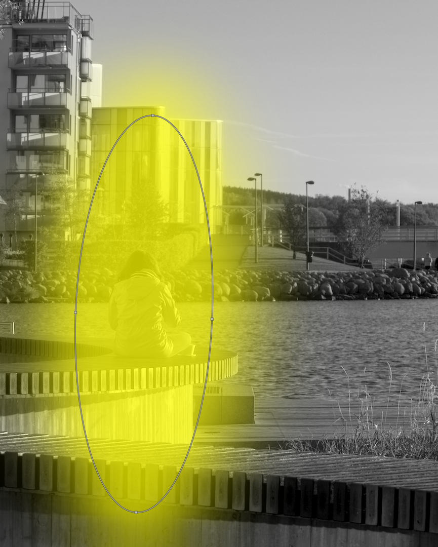 The idea is quite similar to vignetting: use basic adjustments with an elliptical mask to slightly increase the exposure (rule of thumb: about +0.5 EV; here I used +0.33). Make the ellipsis large and use generous amount of feathering and blurring to get a subtle effect that won't be super obvious in the resulting picture. Here's what the mask looked like: